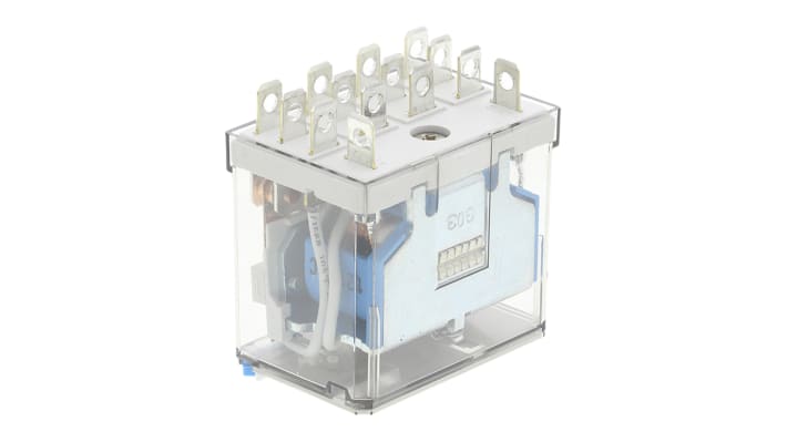 Relè di potenza miniaturizzato 4 PDT, bobina 12V cc, tipo di montaggio A innesto, corrente di commutazione 12A, tensione di commutazione massima 400V ca, potenza di commutazione massima 3 kVA, resistenza bobina 123Ω, potenza bobina 1W, temperatura operativa da -40°C a +70°C, dimensioni 37,6 mm x 27,7 mm x 40,8 mm, materiale contatto lega di argento, autorizzazioni CE, CSA, VDE, IMQ.