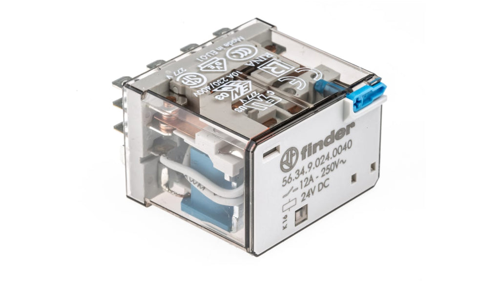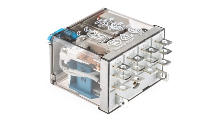 Relè di potenza miniaturizzato a innesto, 4PDT, bobina 24V cc, corrente di commutazione 12A, resistenza bobina 490 ohm, potenza bobina 1W, temperatura operativa -40 °C a +70 °C, contatti in lega di argento-nichel, tipo terminale ad attacco rapido, dimensioni 27.7 mm x 40.8 mm x 37.1 mm, certificazioni CE, IMQ, VDE, CSA. Utilizza connettori femmina serie 96.
