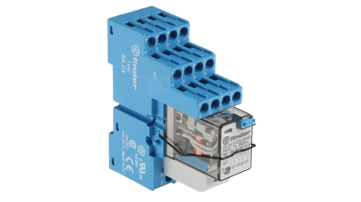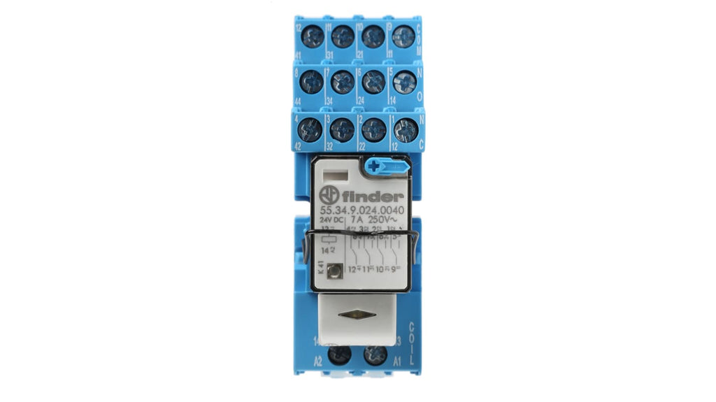 Modulo relè d'interfaccia per guida DIN, bobina 24V cc, configurazione contatti 4PDT, tensione di switching 250V, corrente di commutazione 7A, isolamento 2kV, temperatura di esercizio da -40 a 70 gradi, dimensioni 15.8 x 75.3 x 78.6 mm, collegamento a vite, grado di protezione IP20, approvazioni UL, CE, VDE, CSA. Codice costruttore 58.34.9.024.0050SMA.