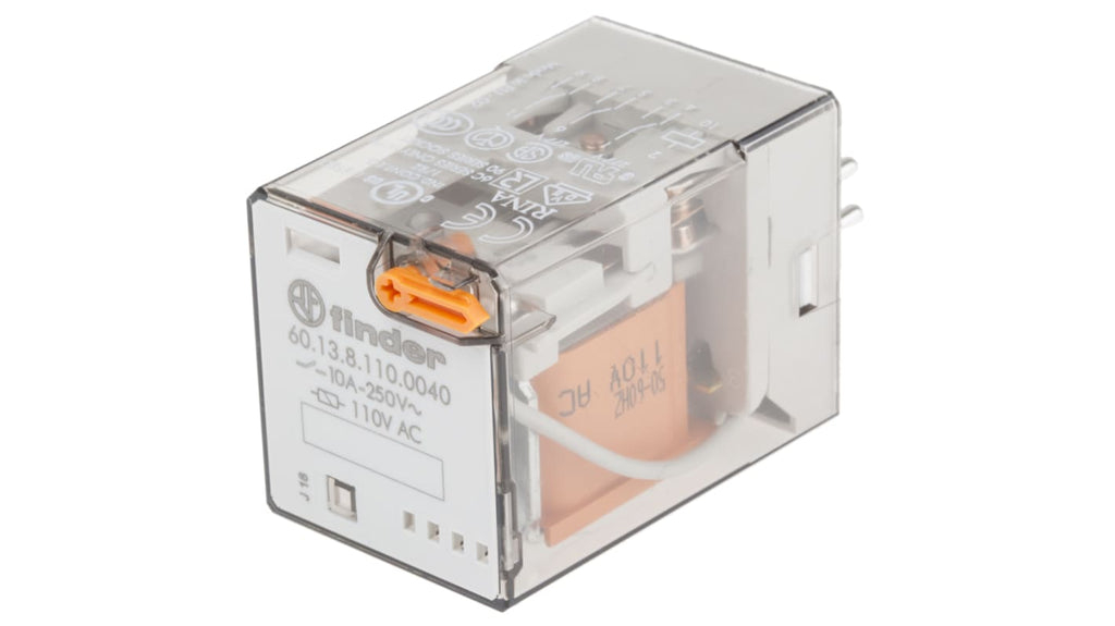 Relè di potenza Finder serie 60, 3PDT, bobina 110V ca, montaggio a innesto, corrente di commutazione 10A, potenza bobina 1,3W, resistenza bobina 1,6Kohm, temperatura operativa -40°C a +70°C, tensione di commutazione massima 400V ca, potenza di commutazione massima 2,5kVA, contatti in lega di argento, tipo terminale pin per circuito stampato, approvazioni UL, CSA, VDE. Dimensioni: 32,5mm x 54,2mm x 36,4mm.