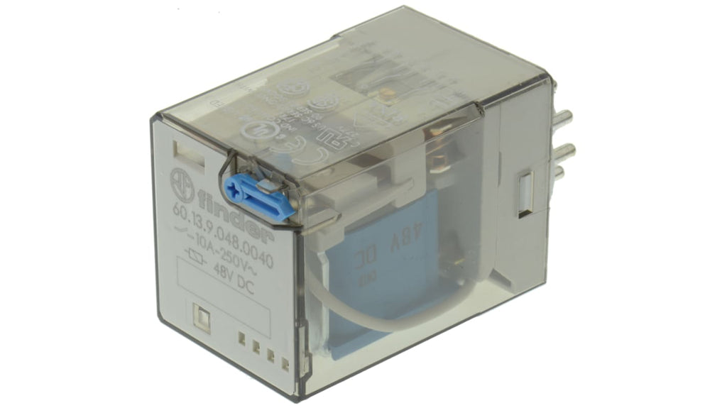 Relè di potenza Finder serie 60, 3PDT, bobina 48V cc, montaggio a innesto, corrente di commutazione 10A, resistenza bobina 1,77 kOhm, potenza bobina 1,3 W, temperatura operativa -40 °C a +70 °C, tensione di commutazione massima 400V ca, potenza di commutazione massima 2,5 kVA, contatti in lega di argento, tipo terminale pin per circuito stampato, approvazioni UL, CSA, VDE. Dimensioni: 32,5 mm x 36,4 mm x 54,2 mm.