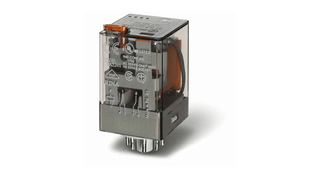 Relè per impieghi generali, bobina 12V ca, montaggio a innesto. Tensione nominale 250 V c.a, corrente di commutazione 6A, 2 poli (CO), contatti senza cadmio, frequenza 50/60 Hz, fornito con contatti standard, compatibile con applicazioni in cantieri navali, pannelli di distribuzione elettrica, sollevatori e gru. Codice costruttore 601280120054, marchio Finder.