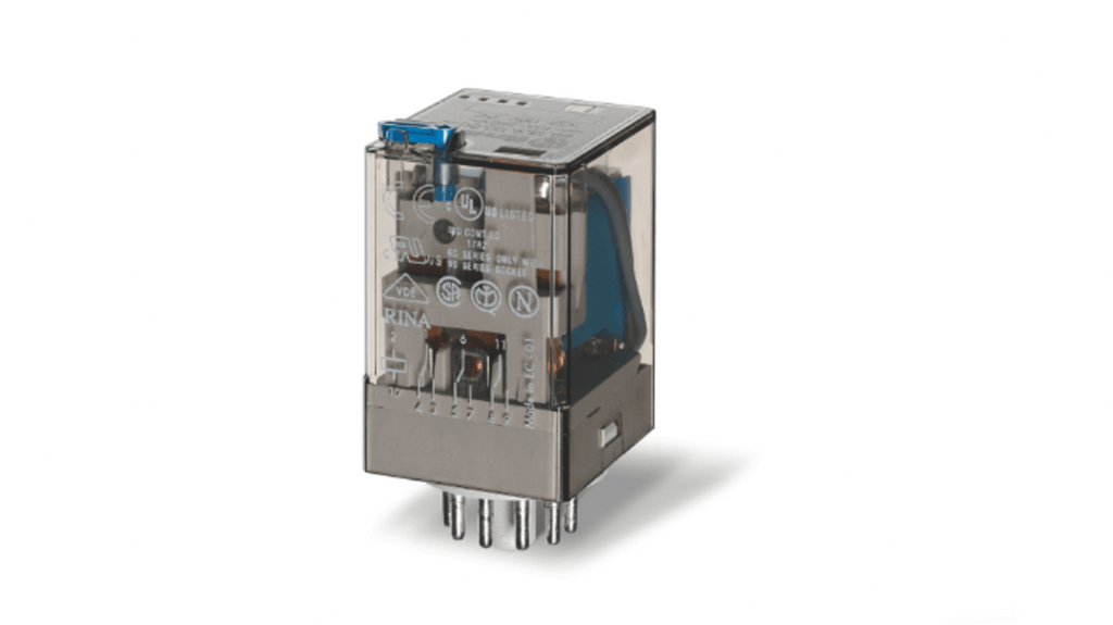 Relè per impieghi generali, bobina 24V cc, montaggio a innesto, corrente di commutazione 10A, contatti di commutazione a 3 poli, contatti senza cadmio, pulsante di prova bloccabile con indicatore a flag meccanico, connettori femmina serie 90, soppressione EMC bobina, accessori per timer serie 86.