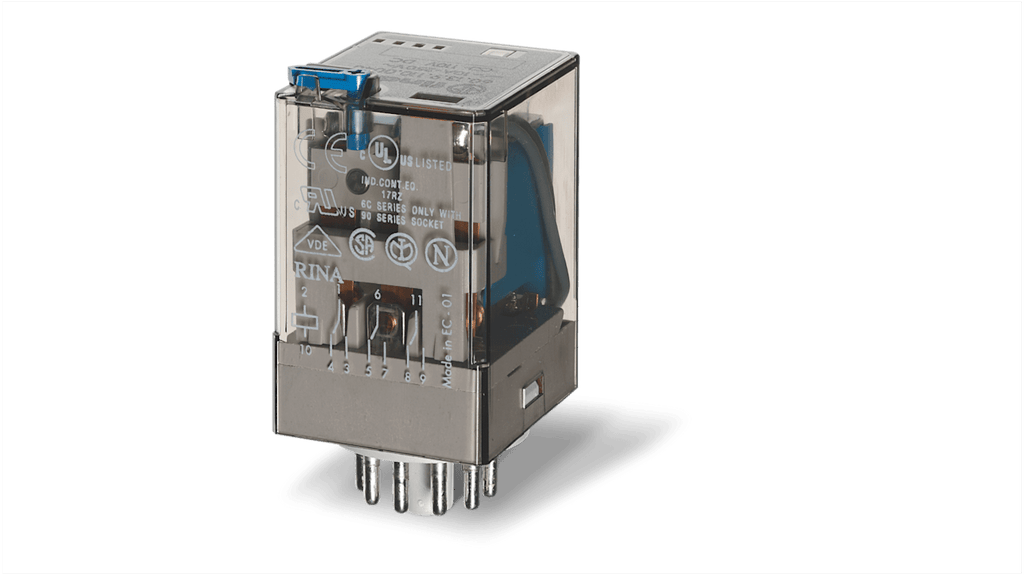 Relè Finder per impieghi generali, 3 poli (CO), configurazione 3PDT, tensione bobina 24V cc, tensione nominale 250V CA, corrente di commutazione 6A, montaggio a innesto (11 pin), contatti in AgNi + Au, contatti senza cadmio. Ideale per applicazioni in cantieri navali, pannelli di distribuzione elettrica, sollevatori, bruciatori e sistemi di controllo.