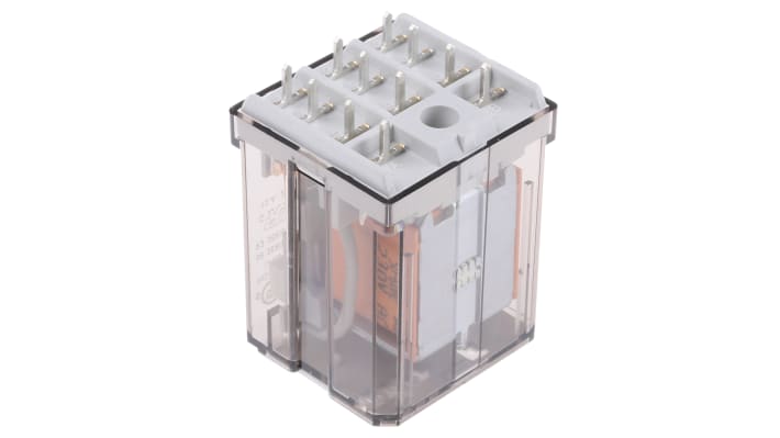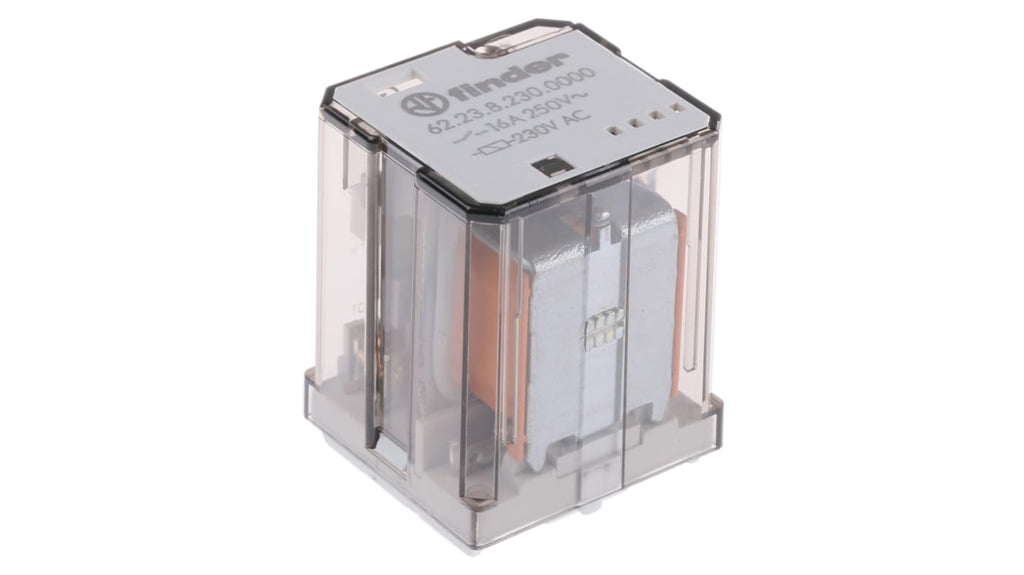 Relè di potenza Finder serie 62, 3PDT, bobina 230V ca, montaggio su circuito stampato, corrente di commutazione 16A, isolamento bobina-contatto 6 kV, materiale contatto lega di argento, resistenza bobina 7250Ω, potenza bobina 2.2W, temperatura operativa da -40°C a +70°C, dimensioni 38.2mm x 35.8mm x 49.1mm, vita 100 x 10³ cicli, conforme a norme UL e VDE.