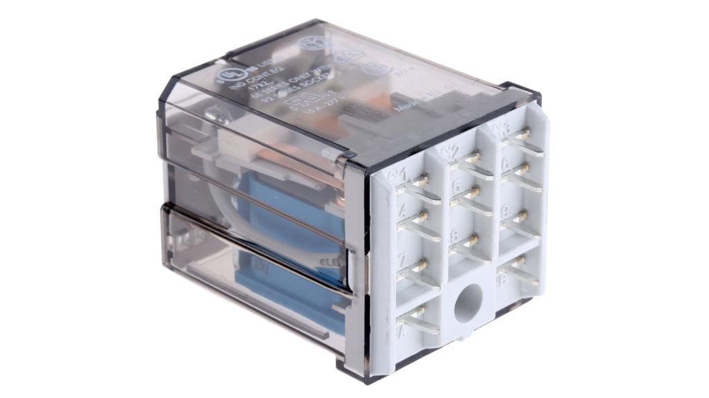 Relè di potenza Finder serie 62, 3PDT, bobina 12V cc, montaggio su circuito stampato, corrente di commutazione 15A, isolamento bobina-contatto 6 kV, materiale contatto lega di argento, resistenza bobina 110Ω, potenza bobina 1.3W, temperatura operativa da -40°C a +70°C, dimensioni 38.2mm x 49.1mm x 35.8mm, vita 100 x 10³ cicli, conforme a norme UL e VDE.