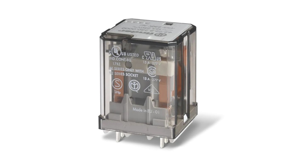 Relè di potenza Finder, 3PDT, bobina 24V, montaggio su circuito stampato, corrente di commutazione 30A, configurazione contatto 3PDT, numero di poli 3, progettato per integrazione su PCB, adatto per applicazioni elettroniche in spazi ridotti.