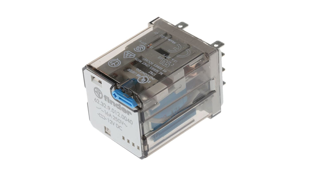 Relè di potenza a innesto, DPDT, bobina 12V cc, corrente 16 A, 2 contatti di commutazione, attacco rapido, tensione di commutazione massima 400V ca, potenza di commutazione massima 4 kVA, resistenza bobina 110Ω, potenza bobina 1.3W, isolamento bobina-contatto 6kV, temperatura operativa -40°C/+70°C, dimensioni 38.2mm x 35.8mm x 49.1mm, conforme a UL, VDE, CE, CSA, ABS.