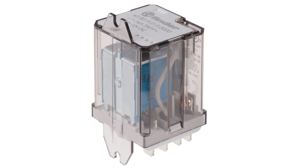 Relè di potenza Finder serie 62, DPDT, bobina 12V cc, montaggio su flangia, corrente di commutazione 16A, tensione di commutazione massima 250V ca, potenza di commutazione massima 4 kVA, isolamento bobina-contatto 6 kV, materiale contatto lega di argento, resistenza bobina 110Ω, potenza bobina 1.3W, dimensioni 68mm x 35.8mm x 38.2mm, temperatura operativa da -40°C a +70°C, autorizzazioni UL, CSA, VDE.