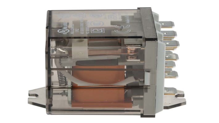 Relè di potenza Finder, serie 62, 3PDT, bobina 230V ca, A innesto, corrente di commutazione 16A, potenza bobina 2,2W, resistenza bobina 7250Ω, isolamento bobina-contatto 6kV, contatti in lega di argento, temperatura operativa da -40°C a +70°C, dimensioni 68mm x 38.2mm x 35.8mm, attacco rapido, certificazioni VDE, UL, CSA, conforme a EN 60335-1.