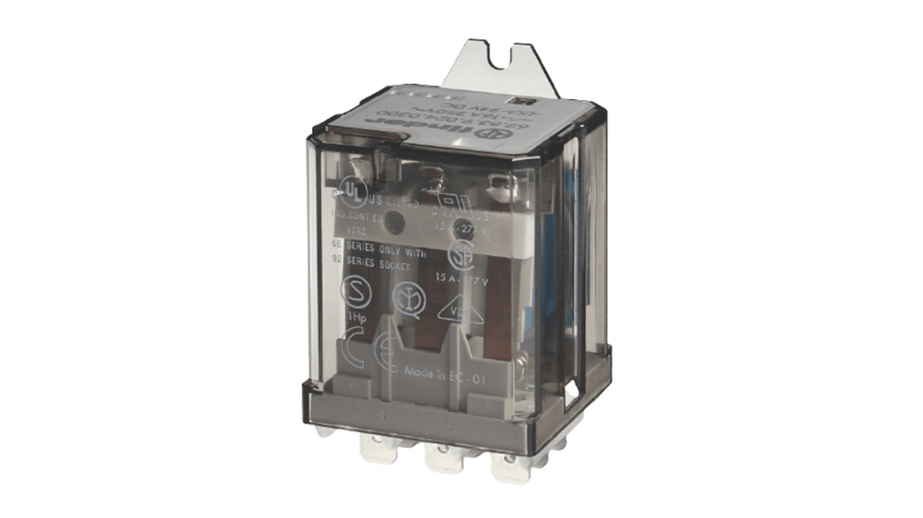 Relè di potenza Finder, 3PDT, bobina 24V cc, montaggio su flangia, corrente di commutazione 16A, resistenza bobina 445 Ω, potenza bobina 1.3W, isolamento bobina-contatto 6kV, dotato di LED, indicatore meccanico, opzioni per pulsante di test, opzione separatore contatto bobina SELV, materiali senza cadmio, conforme a EN 60335-1, brevetto europeo.
