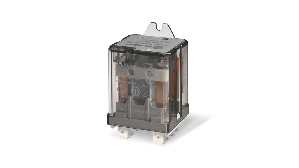 Relè di potenza Finder, DPDT, bobina 230V cc, montaggio su flangia. Tensione bobina 230V cc, configurazione contatto DPDT, corrente di commutazione 16A, numero di poli 2. Approvato CSA e EAC, design compatto per facile integrazione in sistemi di controllo industriali.