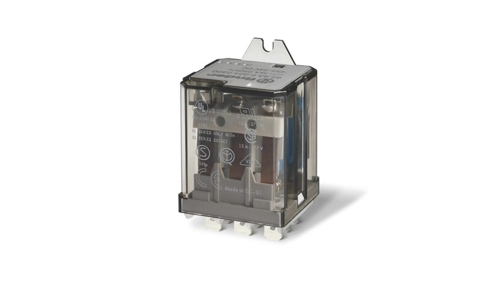 Relè di potenza Finder, 3PDT, bobina 24V cc, montaggio su flangia. Corrente di commutazione 16A, numero di poli 3. Approvato CSA e EAC. Design compatto per integrazione nel sistema di controllo, tecnologia avanzata per rilevamento accurato dei segnali, affidabile per ambienti industriali.