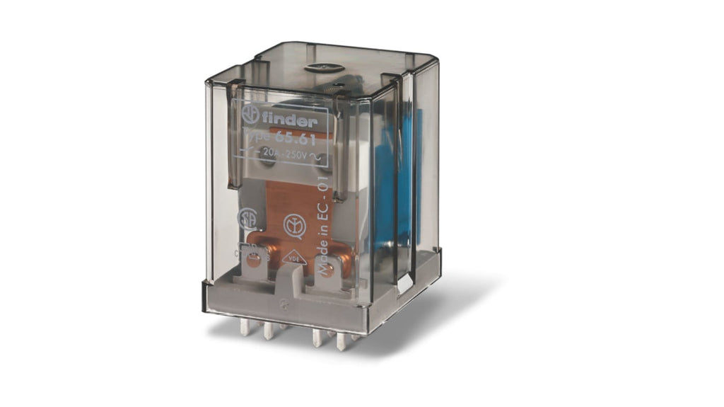 Relè Finder per montaggio su circuito stampato, alimentazione 24V ca, configurazione contatto 1 NO + 1 NC (SPST-NA + SPST-NC), corrente di commutazione 20A, terminali a forcella, materiale contatti AgCdO standard. Utilizzabile in forni a infrarossi, microonde, jacuzzi per lavatrici industriali e vasche idromassaggio. Codice costruttore 656180240000.