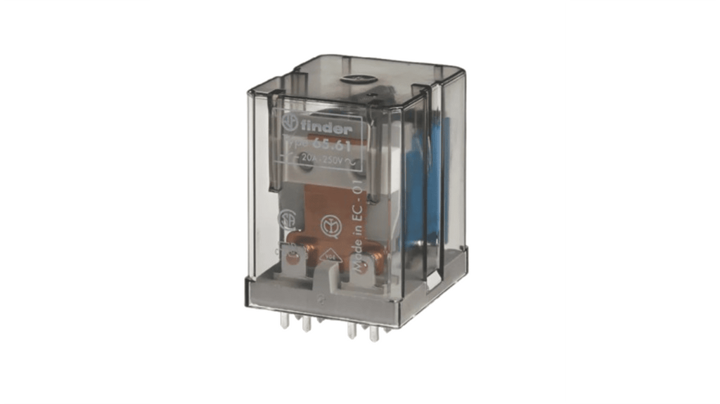 Relè Finder per montaggio su circuito stampato, bobina 24V cc, configurazione contatto SPST, 1 NO + 1 NC, corrente di commutazione 20A, terminali a forcella, materiale contatti AgCdO standard. Adatto per applicazioni in forni a infrarossi, microonde, jacuzzi e vasche idromassaggio. Codice costruttore 656190240000.