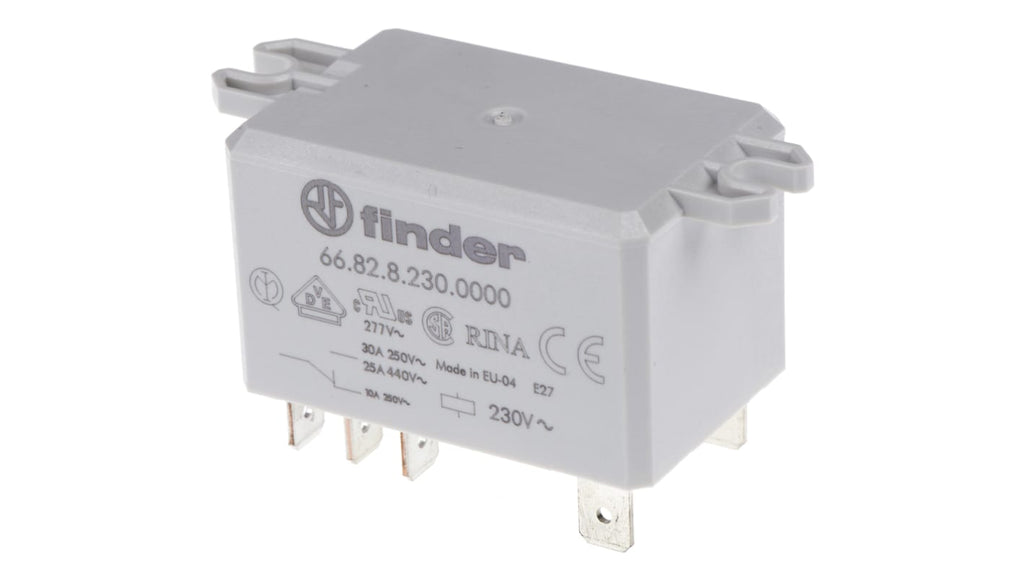Relè di potenza Finder serie 66, DPDT, bobina 230V ca, montaggio su flangia, corrente di commutazione 30A, tensione di commutazione massima 250V ca, potenza bobina 3.6W, isolamento bobina-contatto 6kV, temperatura operativa da -40 a +70 gradi, attacco rapido, materiale contatto lega di argento, dimensioni 68.5mm x 31mm x 33.5mm, conforme a norme VDE, IMQ, cULus.