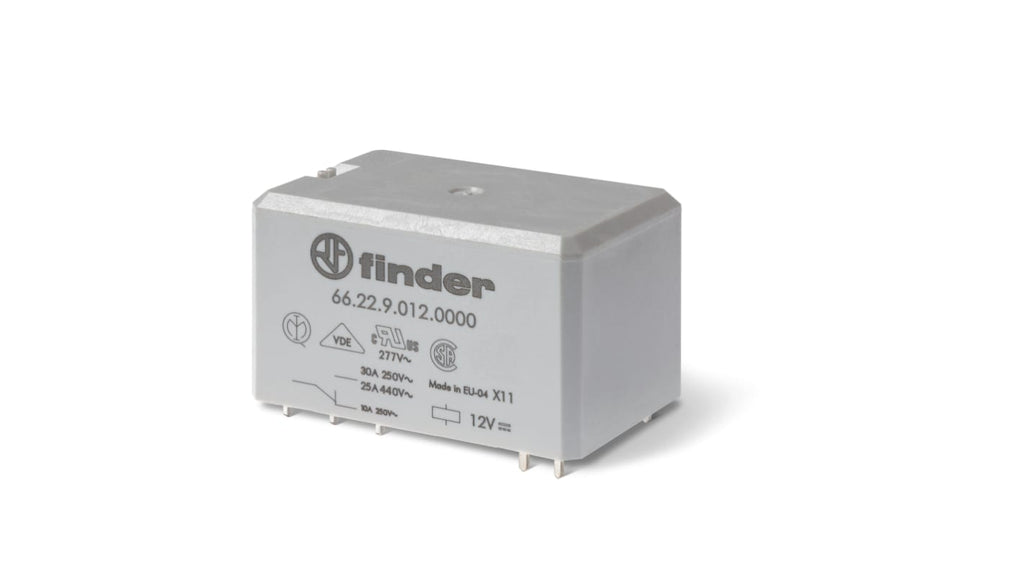 Relè di potenza serie 66 Finder, DPST-2NO, bobina 110V ca, montaggio su circuito stampato, corrente di commutazione 30A, contatti senza cadmio, LED e indicatore meccanico, opzioni di pulsante di prova, terminali bifurcati, non bistabile. Utilizzato in applicazioni industriali come illuminazione, forni e gestione dell'alimentazione elettrica.