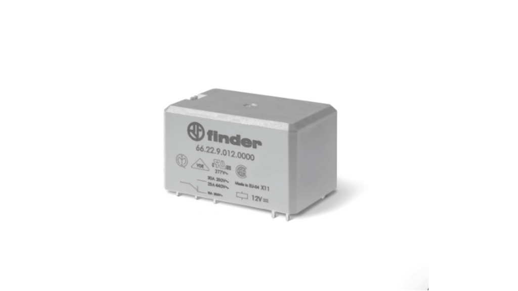 Modulo relè di potenza per guida DIN, bobina 120V cc, configurazione DPST-2NO, corrente di commutazione 30A, 2 poli, isolamento rinforzato tra bobina e contatti, 8 mm di distanza di dispersione e spazio libero, disponibile opzione senza cadmio. Adatto per generatori di potenza, lavatrici industriali, bruciatori, caldaie e forni. Codice costruttore 662290120600S, marchio Finder.