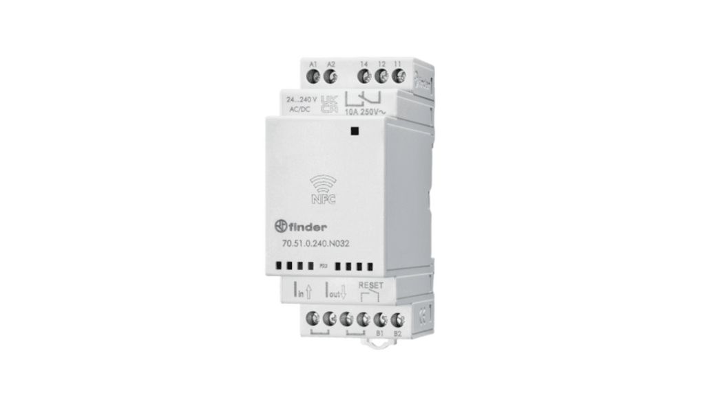 Relè di monitoraggio NFC Corrente multifunzionale, rilevamento di sottocorrente, sovracorrente e modalità finestra, logica di sicurezza positiva, contatto di uscita SPDT, LED a colori per indicazione visiva, programmabile tramite app Toolbox NFC, applicazione di controllo, monofase, gamma di sensibilità alla tensione 0.8 a 1.1V ca/cc, montaggio su guida DIN.