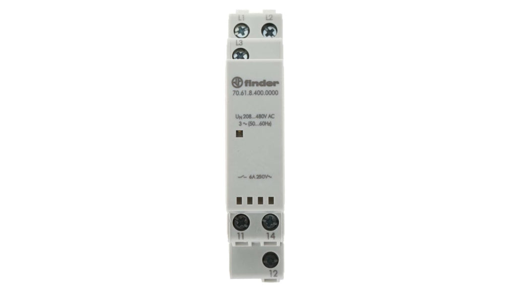 Relè di monitoraggio tensione, SPDT, per applicazioni monofase e trifase, serie 70. Monitoraggio universale da 208 V a 480 V, 50/60 Hz, con logica di sicurezza positiva. Uscita relè 1 CO, 6 A e 2 CO, 8 A. Montaggio su guida DIN 35 mm, dimensioni 60.8 x 17.5 x 87 mm, temperatura operativa da -20 a +60 gradi Celsius. Contatti senza cadmio, regolazione tramite selettore e trimmer.