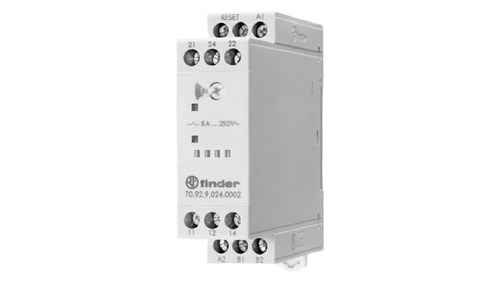 Relè di monitoraggio NFC a termistore per applicazioni industriali, rilevamento della temperatura e cortocircuiti con PTC, logica di sicurezza positiva, contatto che si apre in caso di errore, memoria guasto selezionabile, indicazione di stato a LED, tensione di funzionamento 184-253V ca/cc, montaggio su guida DIN, monofase.