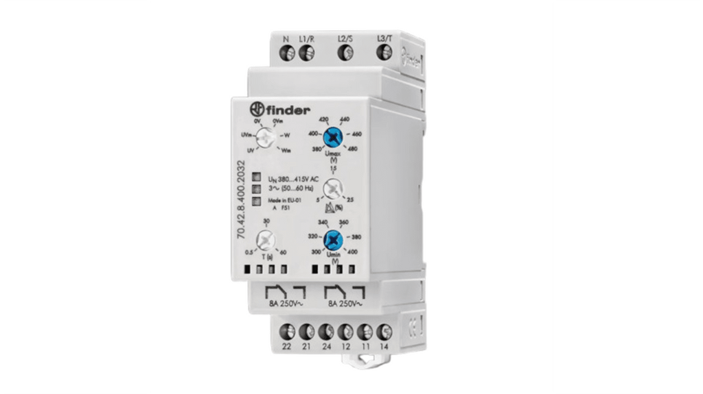 Relè di monitoraggio della tensione elettronica multifunzione. Applicazioni: condizionatori d'aria, macchine per la lavorazione del legno, sollevatori, gru, scale mobili, pannelli di controllo per pompe. Monitoraggio di sottotensione, sovratensione, modalità a finestra, rotazione di fase, perdita di fase, asimmetria, perdita neutra. Tensione operativa: 380-415 V, montaggio su guida da 35 mm, ritardo di spegnimento regolabile.