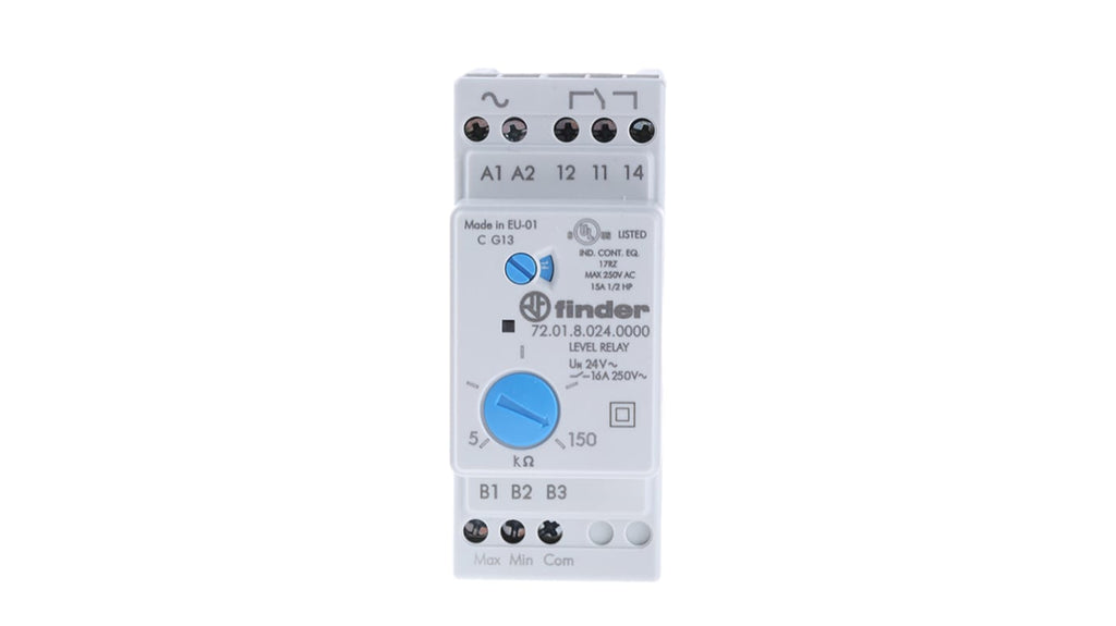 Relè di monitoraggio livello per liquidi conduttivi, serie 72, interruttore SPDT, gamma di sensibilità regolabile da 5 a 150 kΩ, tempo di ritardo selezionabile a 0,5s o 7s, funzioni di riempimento o svuotamento, montaggio su guida DIN, dimensioni 58 x 35 x 84mm, temperatura operativa da -20 a +60 gradi Celsius, terminale a vite.