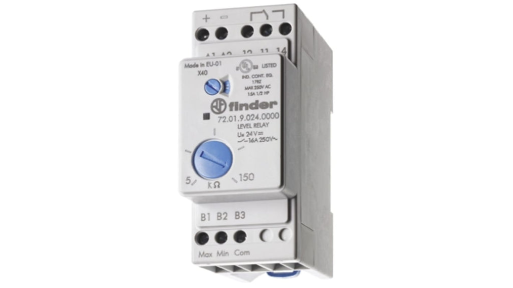 Relè di monitoraggio livello per liquidi conduttivi, serie 72, interruttore SPDT, gamma di sensibilità regolabile da 5 a 150 kΩ, tempo di ritardo selezionabile a 0,5s o 7s, funzioni di riempimento o svuotamento, montaggio su guida DIN, dimensioni 58 x 35 x 84mm, temperatura operativa da -20 a +60 gradi Celsius, terminale a vite.