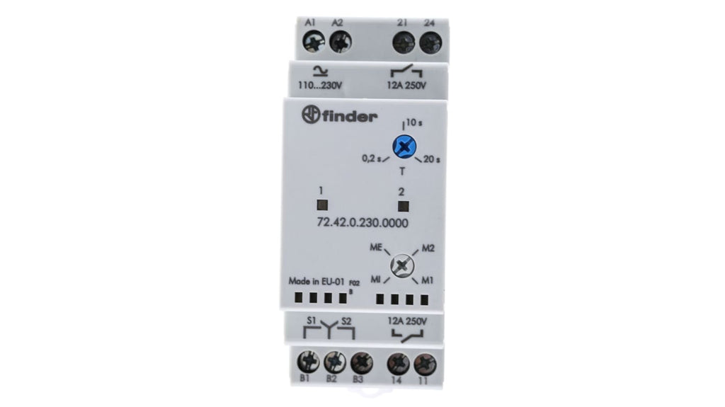 Relè di monitoraggio per carichi alternati, 2 uscite NA indipendenti, corrente 12 A, 2 segnali di comando isolati, contenitore modulare 35 mm, montaggio su guida DIN, configurazione contatto DPST, ritardo 0.2 a 20 s, materiale del contatto senza cadmio, serie 72.