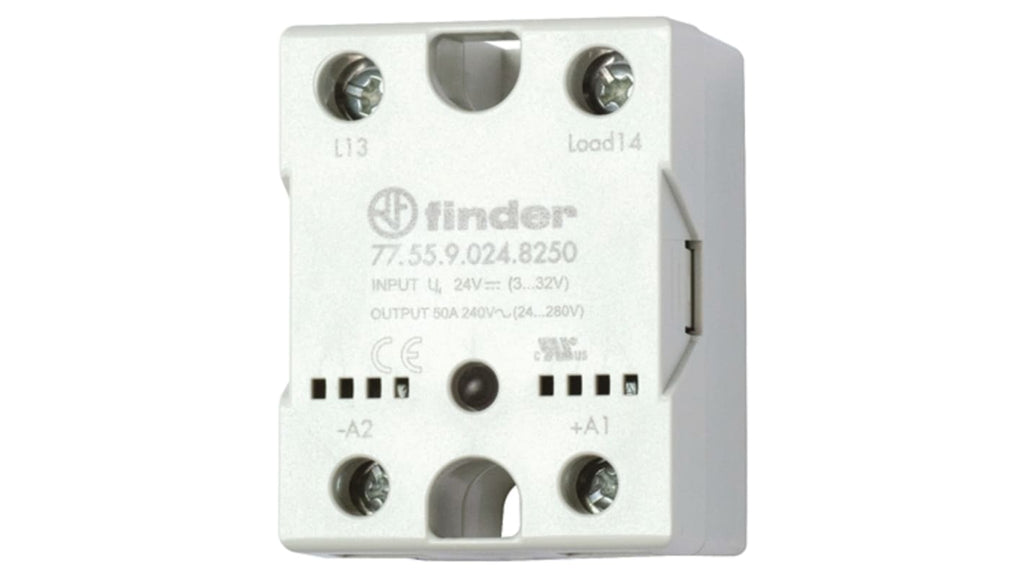 Relè a stato solido a montaggio superficiale, 50 A, 280 V c.a., zero crossing, configurazione SPST, terminali a vite, dissipatore incluso. Corrente minima di carico 250 mA, corrente di dispersione 10 mA, tempo massimo di attivazione 40 ms. Dimensioni 44.5 x 36.4 x 57.7 mm, temperatura di esercizio -30 a +80°C, grado di protezione IP 20. Compatibile con dissipatori per modelli 77.25, 77.45 e 77.55.