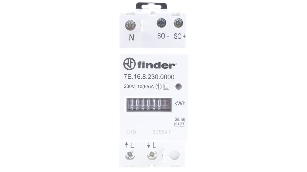 Contatore di energia monofase per guida DIN, serie 7E, classe di precisione 1, display meccanico a 7 cifre. Uscita per conteggio remoto dell'energia, disponibile in versioni da 5 A e 10 A. Dimensioni: 89 mm x 35 mm x 56 mm, temperatura operativa da -10°C a +55°C. Altezza cifra 4 mm, numero di fasi 1, uscita impulsi presente. Codice costruttore 7E.16.8.230.0010.