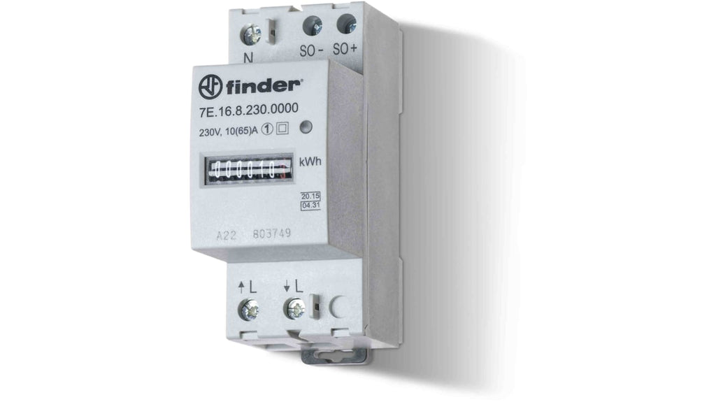 Contatore di energia monofase bidirezionale con display LCD retroilluminato a 7 cifre, visualizzazione consumo totale o parziale in kWh, kVAh, kvarh, misurazione istantanea di V, A, PF, kW, kVA, kvar, Hz e direzione flusso potenza. Uscita impulsi SO programmabile, montaggio su guida da 35 mm, classe di precisione B, temperatura operativa da -25 a +55 gradi Celsius, dimensioni 90.4 mm x 18 mm x 65.2 mm.