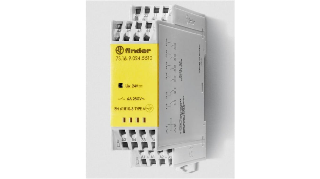 Relè contatti guidati per applicazioni di sicurezza, 24V cc, 6 poli (5NO/1NC), resistenza bobina 571Ω, potenza bobina 2.3W, montaggio su guida da 35 mm (EN 60715), indicazione visiva dello stato con LED, compatibile con ingegneria dei macchinari e applicazioni ferroviarie, tensione di funzionamento 0,7...1,25 UN. Codice costruttore 7S.16.9.024.5510, marchio Finder.
