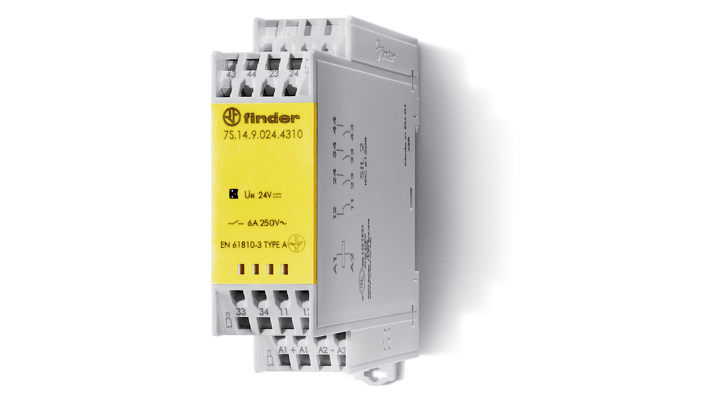 Relè senza blocco con contatti guidati, 3PDT, bobina 230V ca, montaggio su guida DIN. Marchio Finder, codice costruttore 7S3482304310. Configurazione contatto 3PST-NO + SPST-NC, corrente di commutazione 6A, 4 poli. Indicazione visiva dello stato della bobina con LED, larghezza 22,5 mm, terminali a vite. Applicazioni in sicurezza per ferrovie, ascensori, industria chimica e petrolchimica.