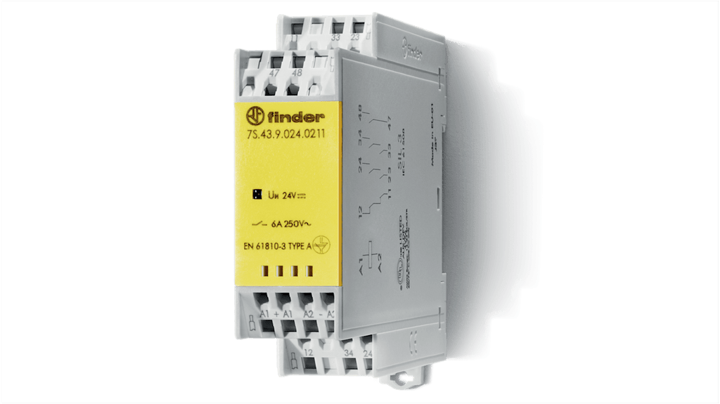 Relè senza blocco con contatti guidati, 3 poli, bobina 24V cc, montaggio su guida DIN. Configurazione 2 NA + 1 NC, corrente di commutazione 6A, architettura a doppio canale 1oo2, indicazione visiva dello stato con LED. Dimensioni 22,5 mm, terminali a vite. Progettato per applicazioni di sicurezza in ambito industriale e trasporti. Codice costruttore 7S6390240211, marchio Finder.
