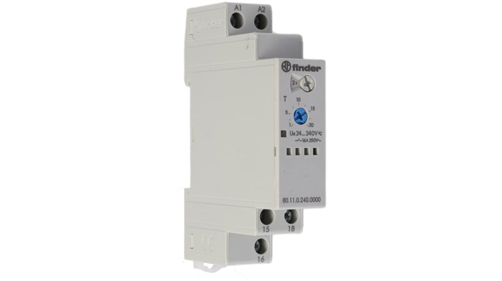 Relè timer a funzione singola Finder, intervallo di ritardo da 0.1 secondi a 24 ore, alimentazione 24-240V AC/DC, contatti SPDT 1C/o, corrente massima 16A, montaggio su guida DIN 35mm, dimensioni 17.5mm x 84mm x 60.8mm, temperatura operativa da -10 a +50 gradi, grado di protezione IP20, certificazioni CE, EAC, RINA, approvazione cULus. Codice costruttore 80.11.0.240.0000.