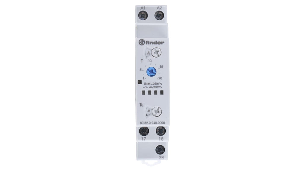 Timer Relay Finder, intervallo temporale 0.1 a 20 minuti e 0.1 a 20 secondi, 2 poli DPST, montaggio su guida DIN, tensione di alimentazione 24 a 240V ca/cc, corrente massima 10A, materiale contatti AgNi, larghezza 17.5 mm, profondità 60.8 mm, lunghezza 84 mm, temperatura operativa da -10 a +50 gradi, tempo di trasferimento regolabile tra 0.05 s e 1 s. Codice costruttore 80.82.0.240.0000.