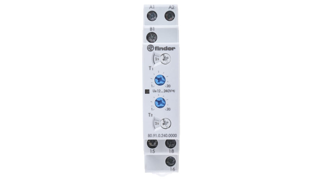 Relè temporizzato multifunzione per guida DIN, intervallo di temporizzazione da 0,1 secondi a 24 ore, alimentazione 12-240V ca/cc, contatto SPDT, corrente massima 16A, dimensioni 17,5mm x 84mm x 60,8mm, temperatura operativa da -10 a +50 gradi, montaggio su binario DIN 35mm, certificazioni CE, EAC, RINA, approvazione cULus.