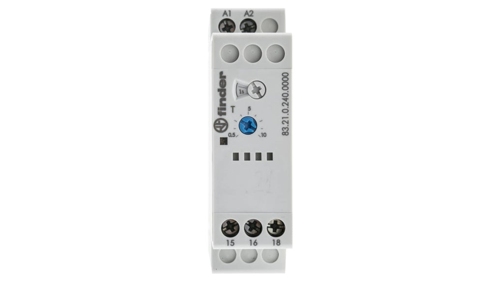 Timer ritardato d'eccitazione, unipolare, larghezza 22,5 mm, otto scale cronologiche da 0,05 s a 10 giorni, isolamento elevato ingresso/uscita, alimentazione 24-240 V ca/cc, montaggio su guida DIN 35 mm, contatti SPDT, corrente massima 16 A, tensione massima 265 V, temperatura operativa da -20 a +60 gradi Celsius, configurazione terminale a vite, serie 83.