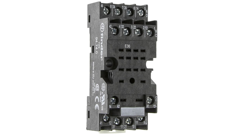 Zoccolo per relè e temporizzatori Finder, compatibile con relè serie 55.32 - 55.34 e temporizzatori serie 85.04. Include connettori femmina, indicazione coil e moduli di soppressione EMC. Fornisce soppressione emf coil, indicazione LED, protezione contro inversione di polarità, by-pass per correnti di dispersione. Corrente nominale 10A. Colore nero. Codice costruttore 94.740SMA.