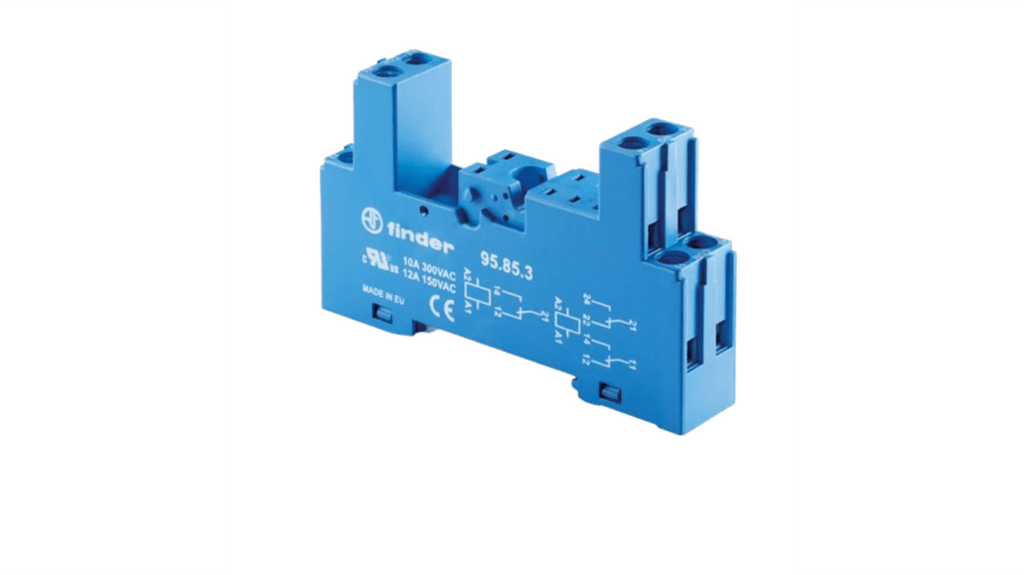 Zoccolo per relè a innesto, connettore femmina per montaggio su circuito stampato o guida DIN da 35 mm, morsetti a vite. Tensione nominale 250V, compatibile con relè serie 40.51, 40.52, 40.61, 40.62. Serie 95. Montaggio a pannello o su guida. Codice costruttore 95853SPA, marchio Finder.