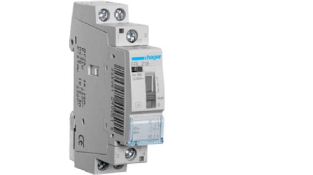 Relè contattore Hager, serie ERL, 2 poli, 1NA+1NC, corrente nominale 16 A, potenza nominale 3 kW, tensione bobina 12 V c.a., frequenza 50 Hz, coppia di serraggio 1,2 Nm, dissipazione di potenza 2,9 W, perdita di potenza totale 3,9 W, temperatura d'esercizio da -10 a 40 °C, indice di protezione IP2X, dimensioni 60 mm di profondità, 83 mm di altezza.