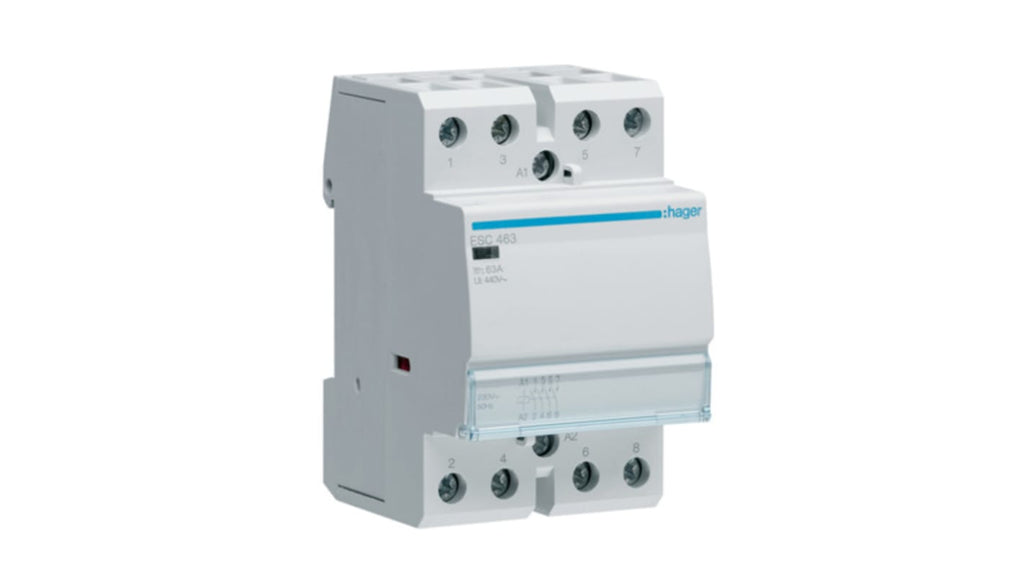 Contattore Hager, serie ESC, 4 poli, 4NO, 63 A, 6,5 kW, bobina 230 V ca. Tensione nominale contatto 400 V c.a., corrente nominale contatto 63 A, montaggio su guida DIN, collegamento a vite, temperatura operativa da -10°C a +50°C, conforme a RoHS, certificato NF EN 61095. Design modulare, versione silenziosa consigliata per aree residenziali.