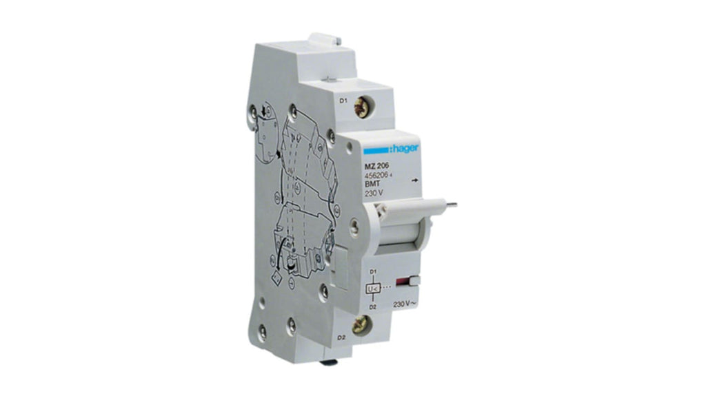 Sganciatore di minima tensione per guida DIN, serie MZ, Hager. Rilascio sottotensione RCCB, attivazione automatica tra 70-35% di 230 V, chiusura RCCB solo oltre 85% di Un. Tensione nominale 230 V c.a., morsetti a vite, montaggio su guida DIN. Range di temperatura operativa -25 a +60 gradi Celsius.