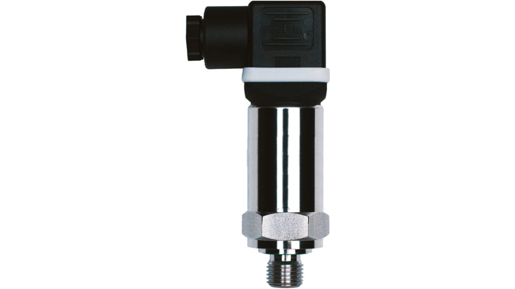 Sensore di pressione assoluta Jumo, trasduttore per lettura di pressioni relative e assolute, pressione massima 400 bar, minima 1 bar, precisione 0,5%, fluido misurato: idraulico e pneumatico, collegamento processo G1/4, collegamento elettrico DIN 43650 tipo A, uscita analogica 4-20 mA, tensione di alimentazione 15-30 V c.c., custodia in acciaio inox, grado di protezione IP65, temperatura operativa da 0 a 80 gradi Celsius.