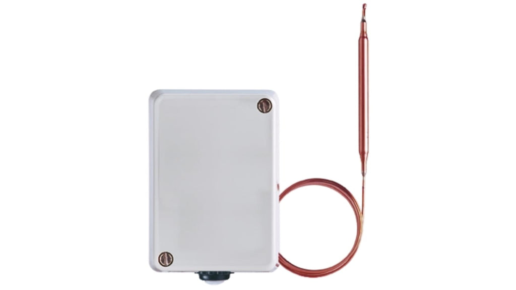 Termostato capillare per monitoraggio temperatura, punto di commutazione regolabile dall'interno, temperatura minima +50°C, temperatura massima +300°C, configurazione interruttore NO/NC, portata nominale contatto 10A, tensione nominale contatto 230V ca/cc, tipo terminale Solder Tab, montaggio superficiale, reset manuale. Codice costruttore 603021/02-2-064-30-2000-40-10-00-00-000-00-6/000, marchio Jumo.