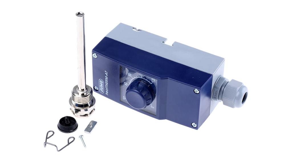Termostato capillare Jumo heatTHERM-AT, temperatura minima 0°C, temperatura massima +120°C, configurazione interruttore SPST, portata nominale contatto 16A, tensione nominale contatto 230V ca/cc, tipo terminale a vite, montaggio superficiale, reset automatico, punti di commutazione regolabili dall'esterno, tecnologia di collegamento a innesto, grado di protezione IP54.