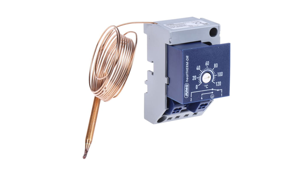 Termostato capillare Jumo, monitor di temperatura heatTHERM-DR, lunghezza capillare 2000 mm, temperatura operativa da 0 a 120 gradi Celsius, configurazione interruttore NO/NC, portata nominale contatto 16A, tensione nominale contatto 250V ca, montaggio superficiale, tipo terminale a vite, reset automatico, grado di protezione IP20, conforme a standard DIN EN 14597.