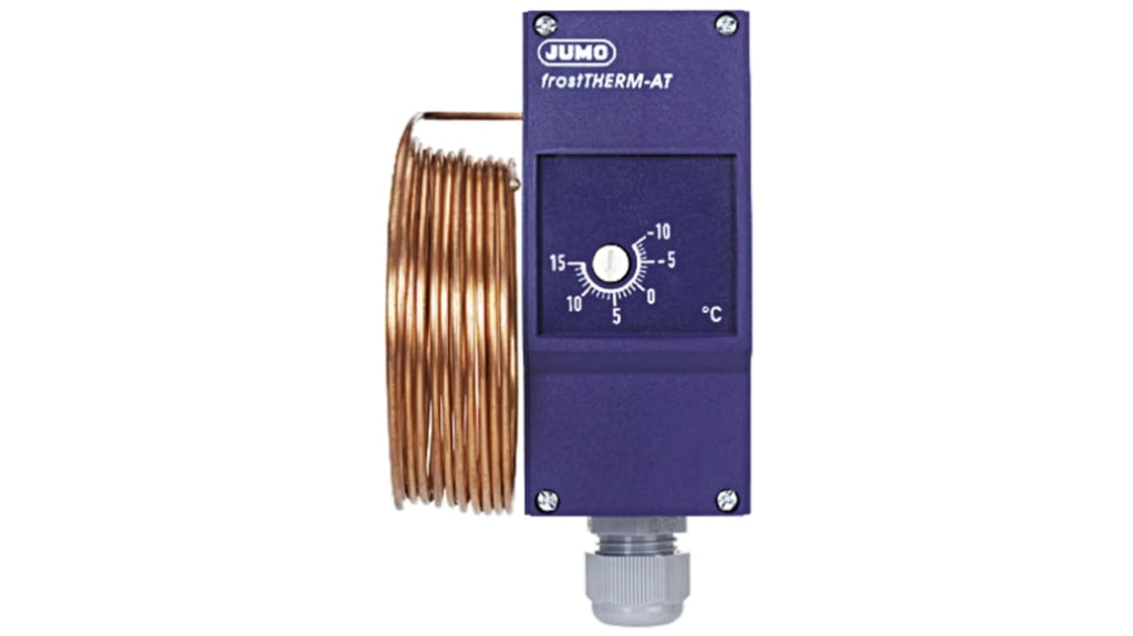 Termostato capillare per protezione antigelo, temperatura minima -10°C, temperatura massima +15°C, configurazione interruttore SPST, portata nominale contatto 16 A, tensione nominale contatto 230 V, montaggio a parete, tipo terminale Push In, lunghezza filo sonda 3000 mm o 6000 mm, grado di protezione IP40 o IP65, tecnologia di collegamento a innesto per riduzione tempi di installazione.