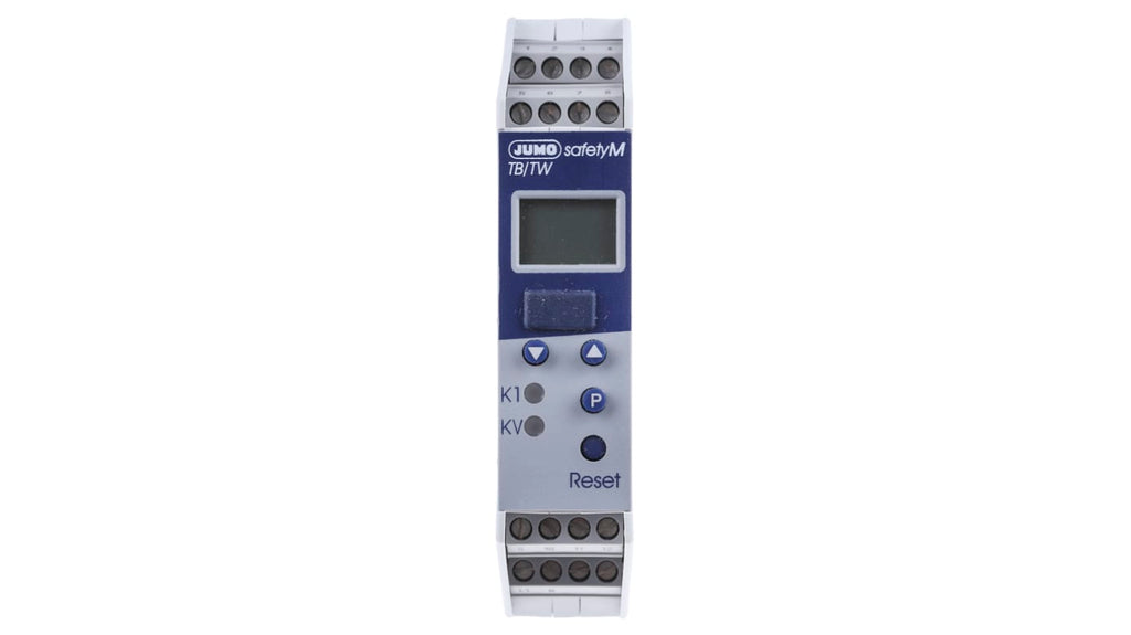 Limitatore di temperatura Jumo safetyM TB/TW, tensione di alimentazione 110-240 V ac, dimensioni 22,5 x 109 mm, 2 uscite relè, ingresso configurabile per sonde PT100, termocoppie, segnali di corrente e tensione, display LC monocromatico, grado di protezione IP20, montaggio su guida DIN, temperatura operativa da 0 a 55 gradi Celsius, certificato EN 61326.